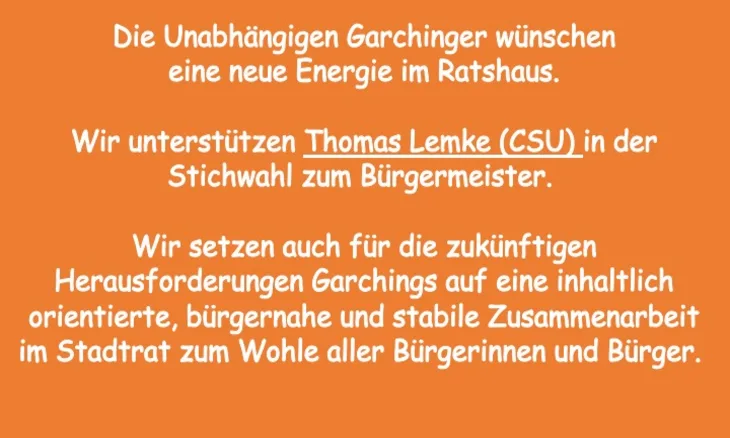 Liebe Bürgerinnen und Bürger aus Garching, Hochbrück und Dirnismaning, wir wünschen uns eine neue Energie im Rathaus und unterstützen Thomas Lemke als Bürgermeisterkandidat.